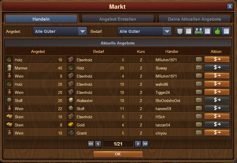 Hier kommt der Handel mit anderen Spielern zur Geltung, ich kann unmöglich alle notwendigen Güter selbst herstellen. Das Handelsfenster ist wunderbar simpel umgesetzt, bietet dabei aber eine breite Vielfalt an Optionen (so kann ich etwa Angebote nur für Gildenmitglieder sichtbar machen).